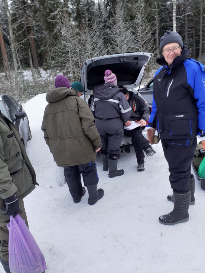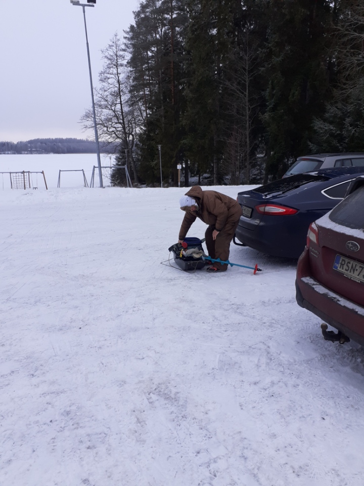Karinniemi klo 10 – 13.30, 10 suurimman ahvenen kilpailu. Pakkasta -6 astetta, tuulta 4 m/s. 15 pilkkijää. Jäätä 27 cm.