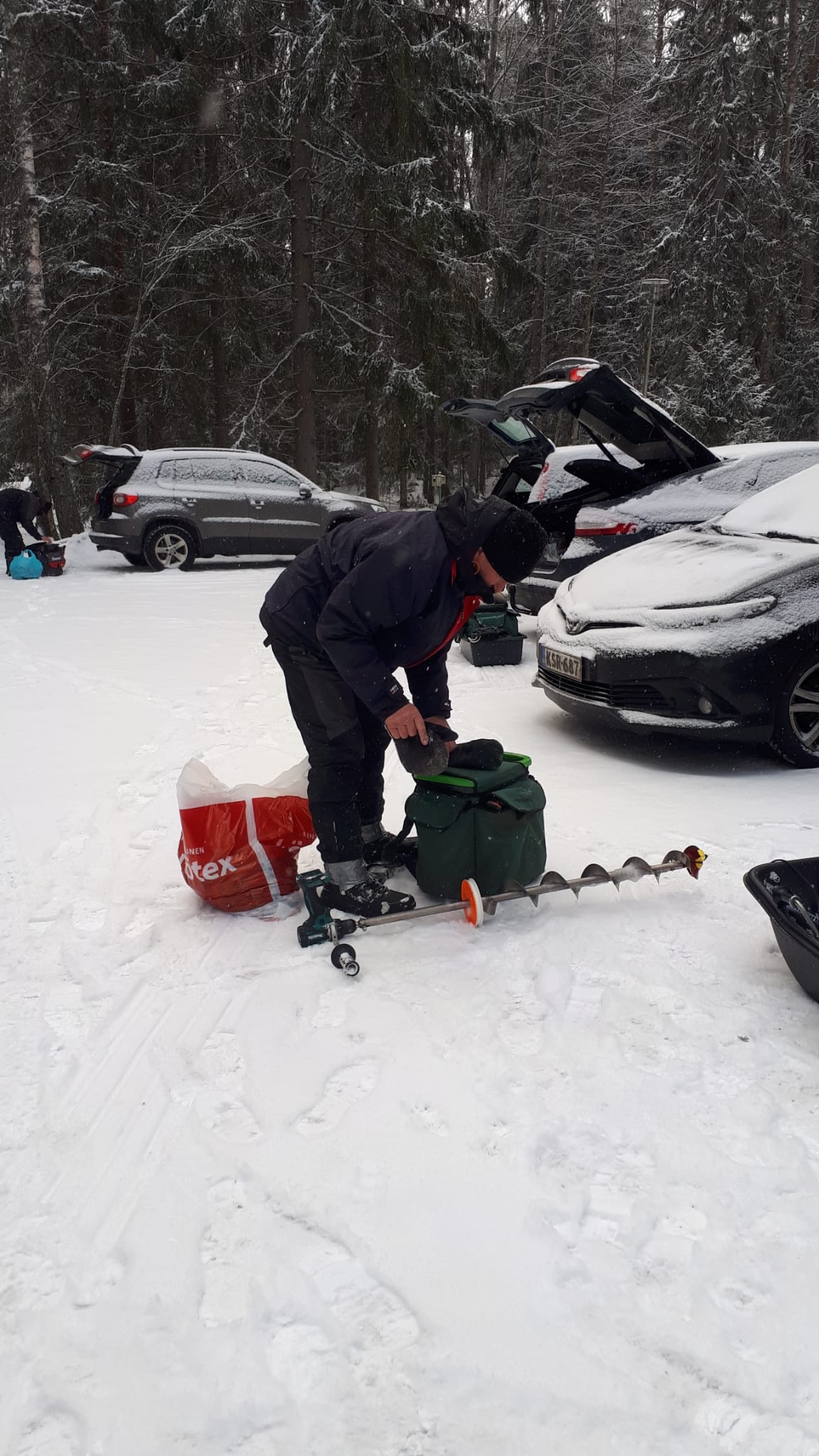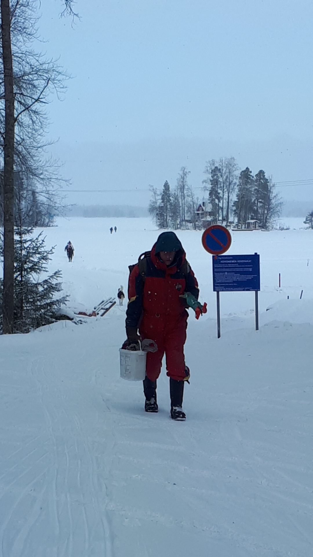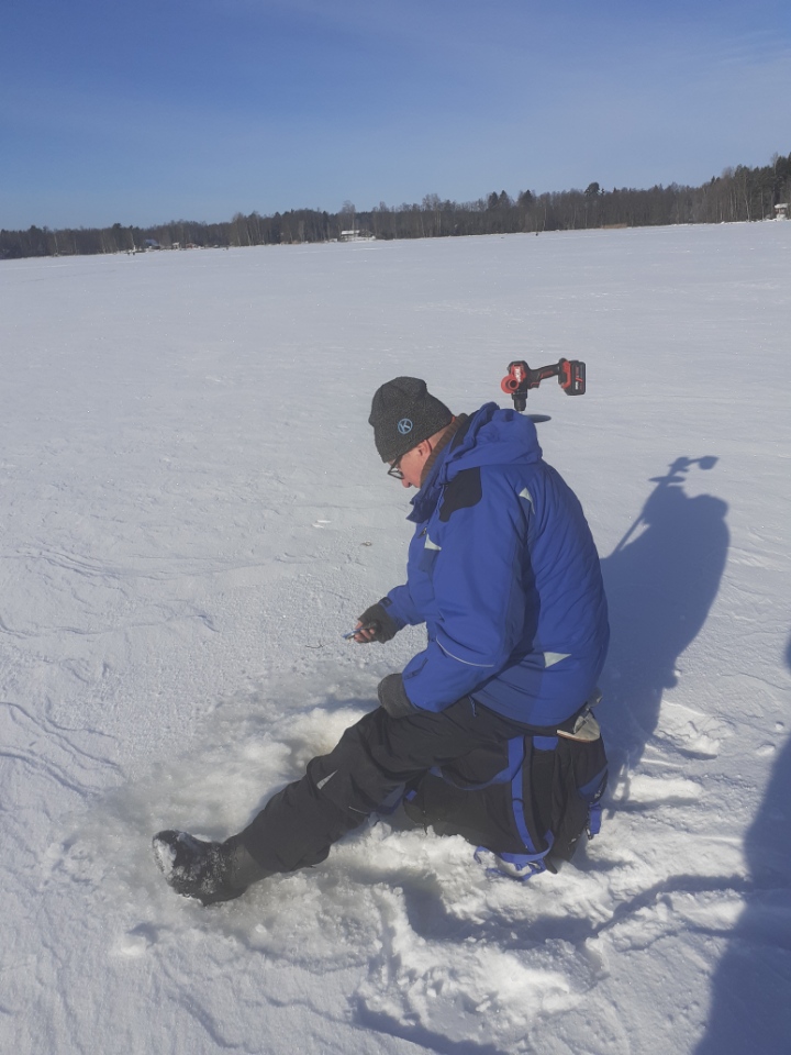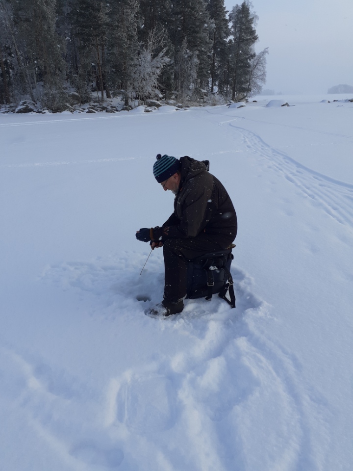 -13 pakkasta, jäätä 42 cm, lunta 20 cm vesi välissä toisin paikoin.