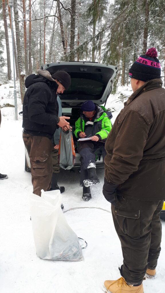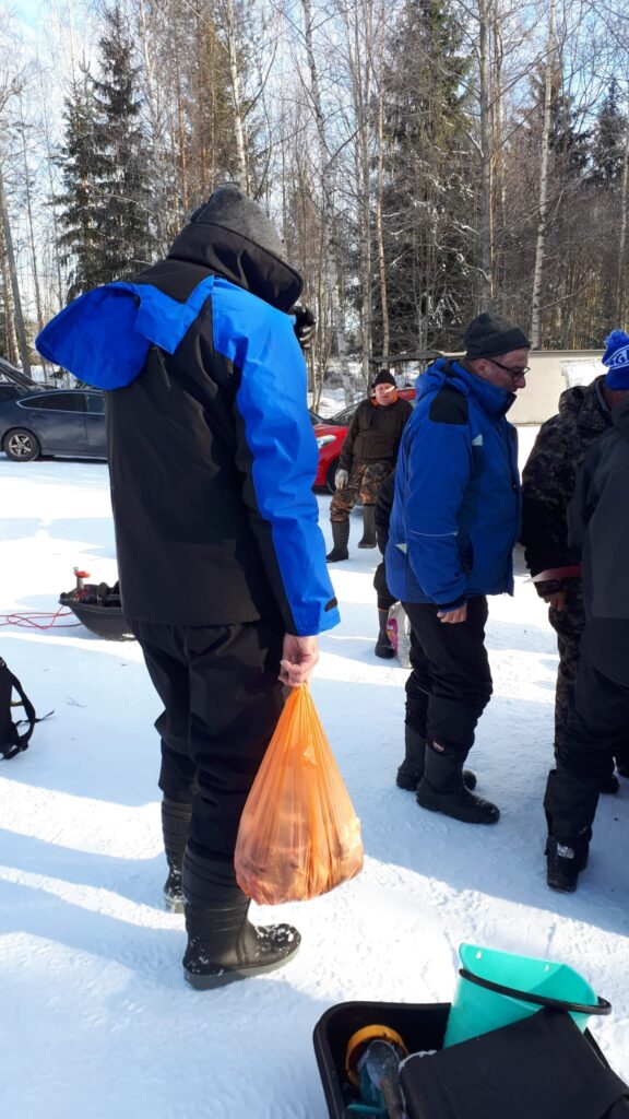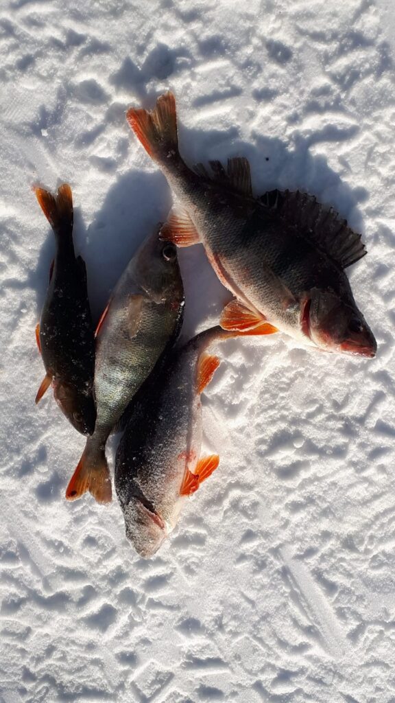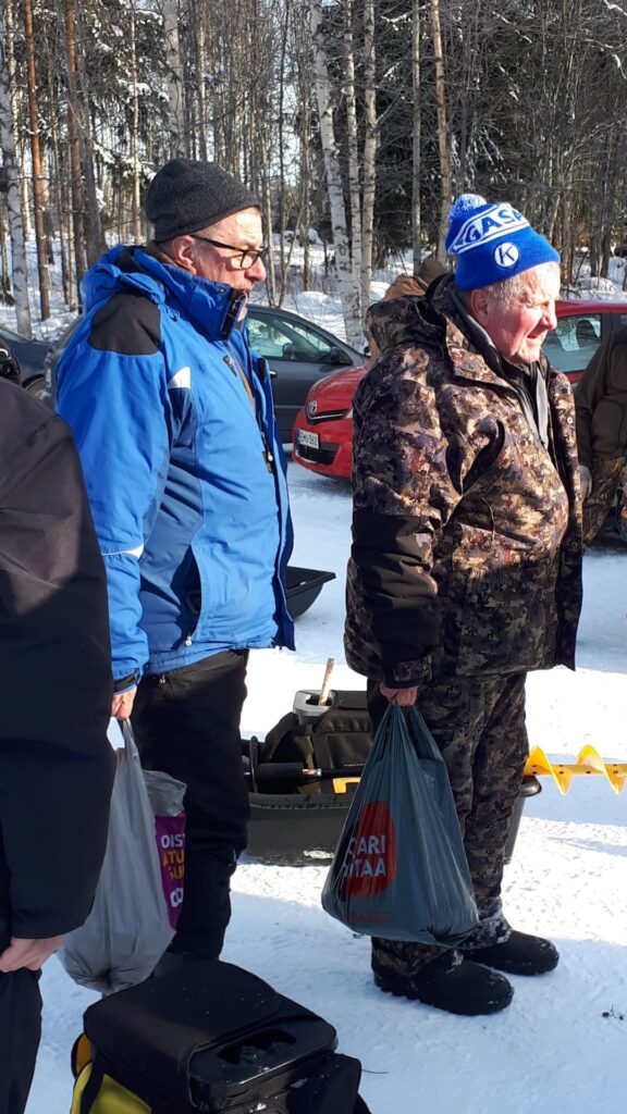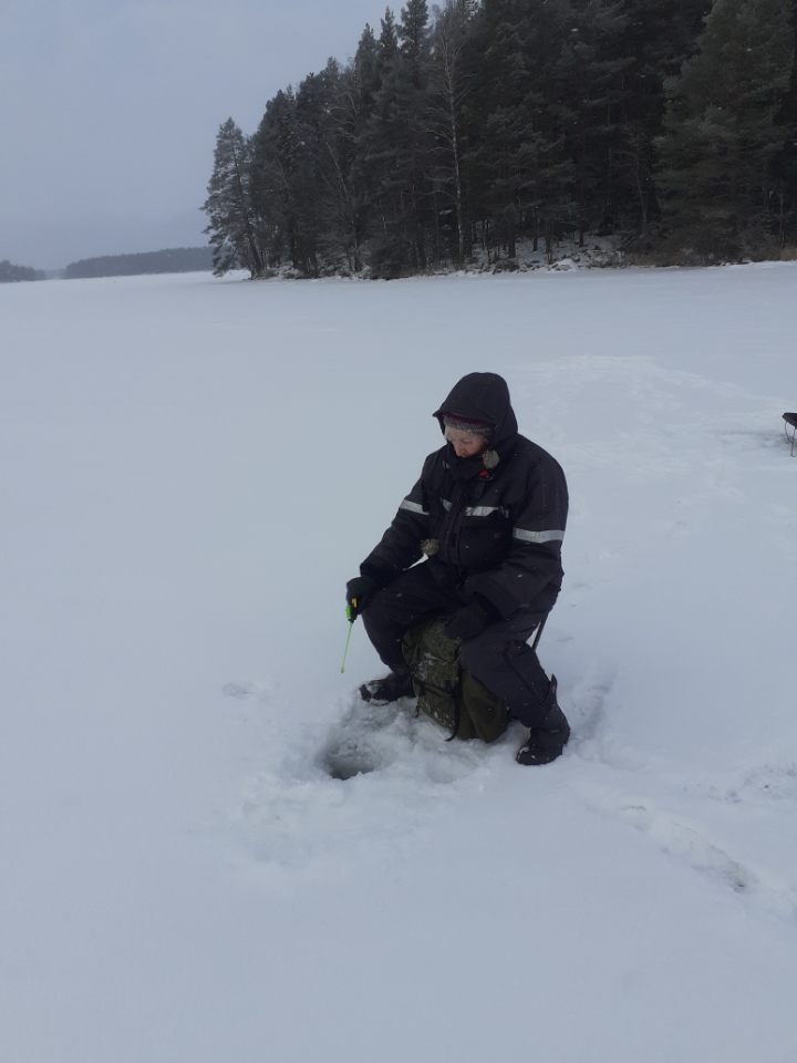 Karinniemi klo 10 – 13.30, 10 suurimman ahvenen kilpailu. Pakkasta -6 astetta, tuulta 4 m/s. 15 pilkkijää. Jäätä 27 cm.