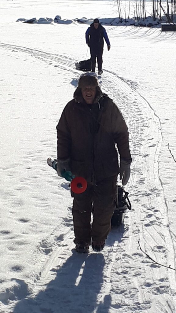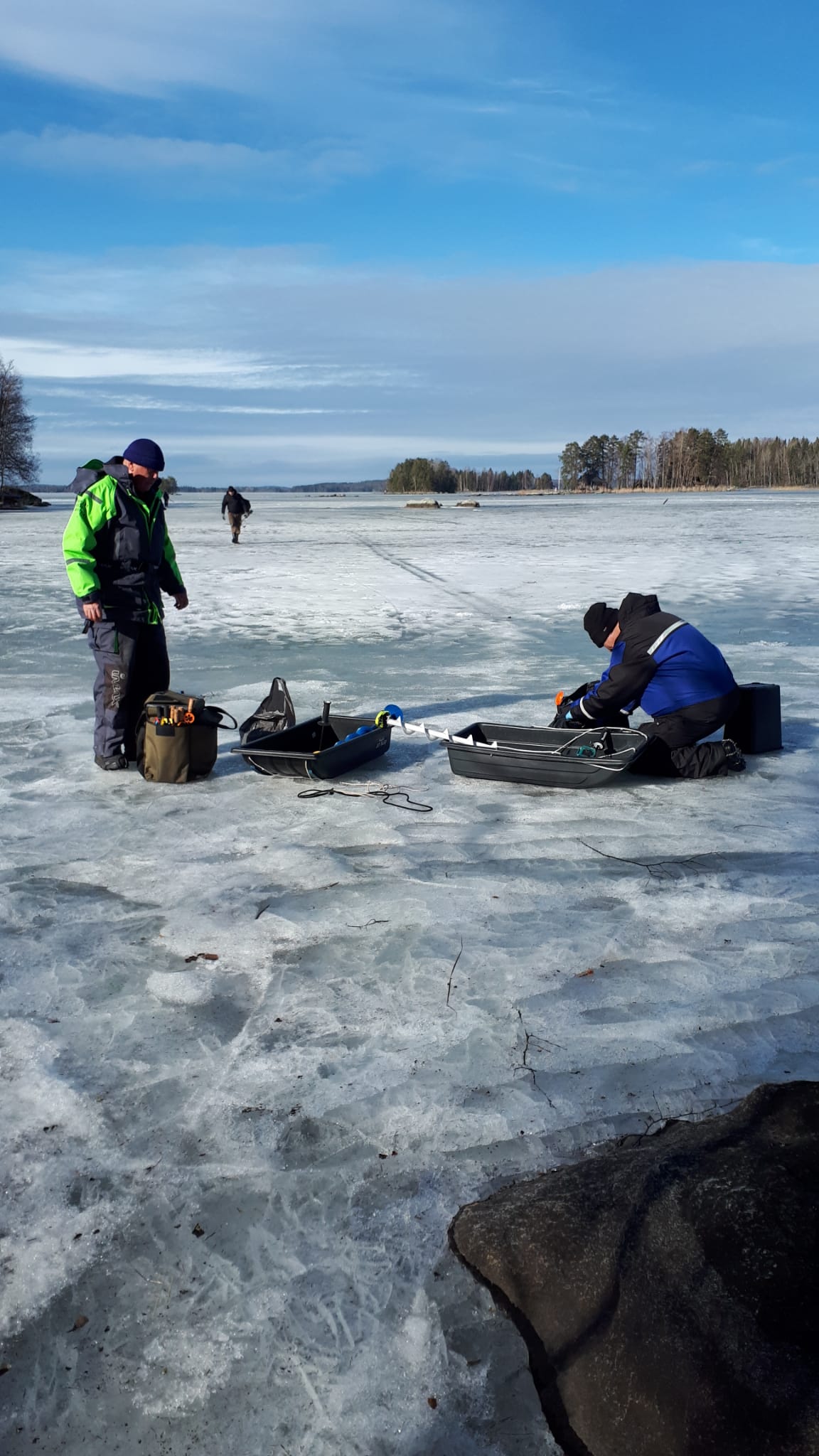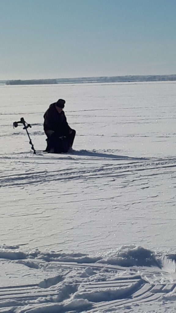 Heritynniemi klo 9 – 12.30. Pakkasta -12 astetta, jäätä yli 50 cm, 10 pilkkijää.